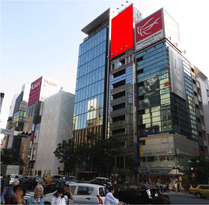 銀座・有楽町駅から徒歩3分ほど、晴海通り沿いのニュウ銀座千疋屋ビル屋上に設置された看板広告です。(隣のビルにはアルマーニ銀座タワーがあります)