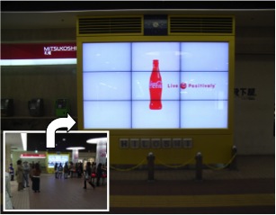 黄色のボックスの大型ビジョン。交通の要所である大通駅改札口前にあり、人通りの途切れる事はない。札幌の中心で三越、パルコ、4プラ等が隣接し、市民の待ち合わせスポットNo.1として定着している。