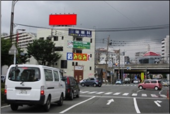 パピヨン通り・妙見通り沿いにある看板広告です。どちらの通りも4車線ある通りのため、クルマの往来はたくさんある通りです。近くには福岡市民病院、東公園などがあり、人の往来も見込めます。