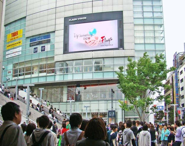 JR新宿駅東南口に立地。ファッション・音楽・スポーツなどの流行発信スポットFlagsビル壁面。
