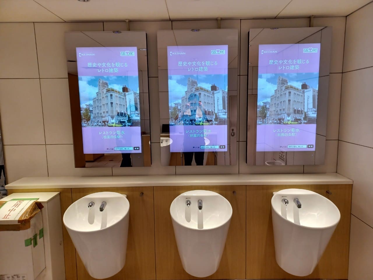媒体概要】 鏡の中から文字や映像が浮かぶサイネージシステムです。 <設置箇所> 上方温泉一休:正面玄関、券売機横、女性専用ドライヤー室 近鉄大和西大寺駅構内モール:ショッピングモールの女性トイレ 京阪電気鉄道 祇園四条駅:女性トイレ