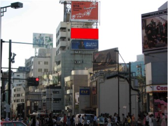 明治神宮駅近く、神宮前交差点沿いに設置された看板広告です。昼夜問わず多くの人が行き交う場所です。