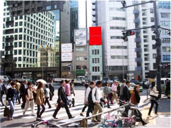 外苑前駅すぐの青山通り沿いに設置された看板広告です。多くの外苑前駅利用者や、信号待ちの走行車からも視認可能です。