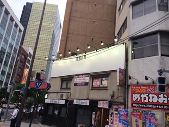 平日はビジネスマン向け、土日祝日には多くの人で賑わう秋葉原の歩行者天国からも一区画の場所にある看板広告です。